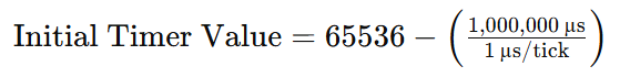 Let’s get back to our today’s focus to generate delay with timers. So we want to blink an LED with a delay of 1 second (1,000,000 microseconds). Here’s how you would calculate and implement this delay: