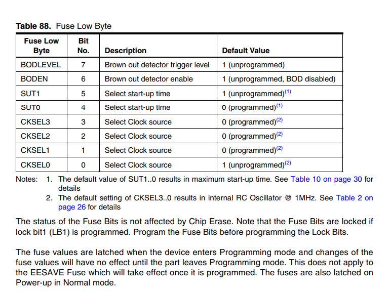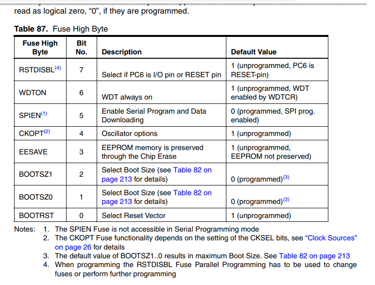 Atmega8 have two fuse bytes as you may see in above picture. These bytes are named with high fuse byte and low fuse byte respectively. We can program them accordingly and they specify a specific behavior. Here are tables taken from ATmega8 Datasheet