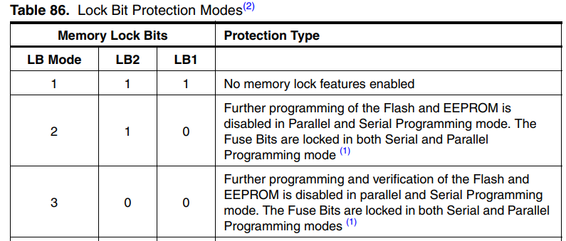 So in first mode when we make both bits 1. We left them not programmed. It mean there is no lock feature enabled and no protection is done. If we just program LB1 in second mode by making it zero. It means that we just disabled further programming FLASH and EEPROM. If we make both of these bits zero it means we had also disabled further programming as well as verification of the code through external programmer. One point to remember here is that we can still full erase microcontroller and use it just as before.