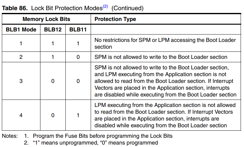 The second provided group of protection or lock bits are for protecting boot-loader area. It forces SPM and LPM to stay away from Boot Loader section. It supports 4 modes and here is the table from datasheet explaining the behavior of these bits.