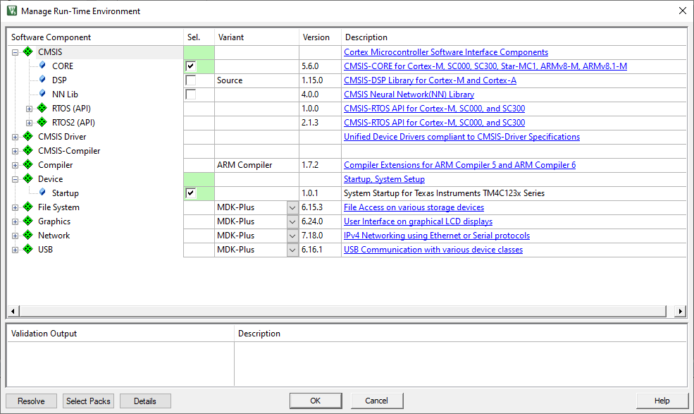 Once selected, Press OK. It will take you to the next window which is about managing the Run-Time Environment. Where you have to select the CORE option under the CIMSIS and from the Device Option select the Startup. This will look something like below.
