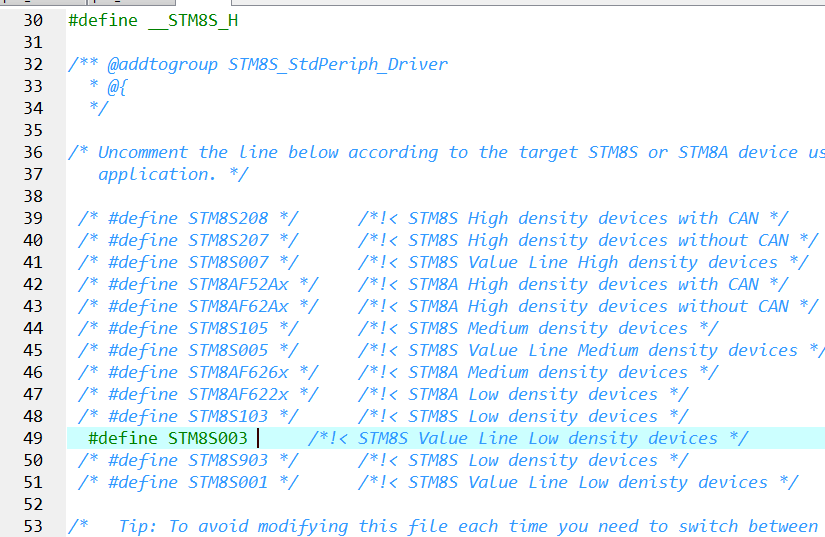 Once you created your project and you try to compile it, you may see the error which is basically related to the assertions. One more thing you need to change is into the STM8S.h header file and you need to uncomment your prefered STM8S part number. This may look like in the following picture